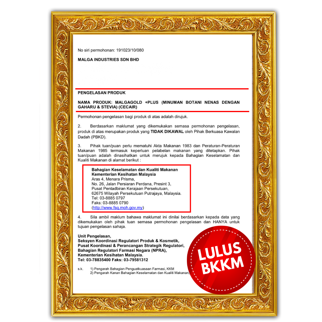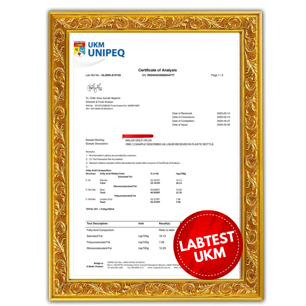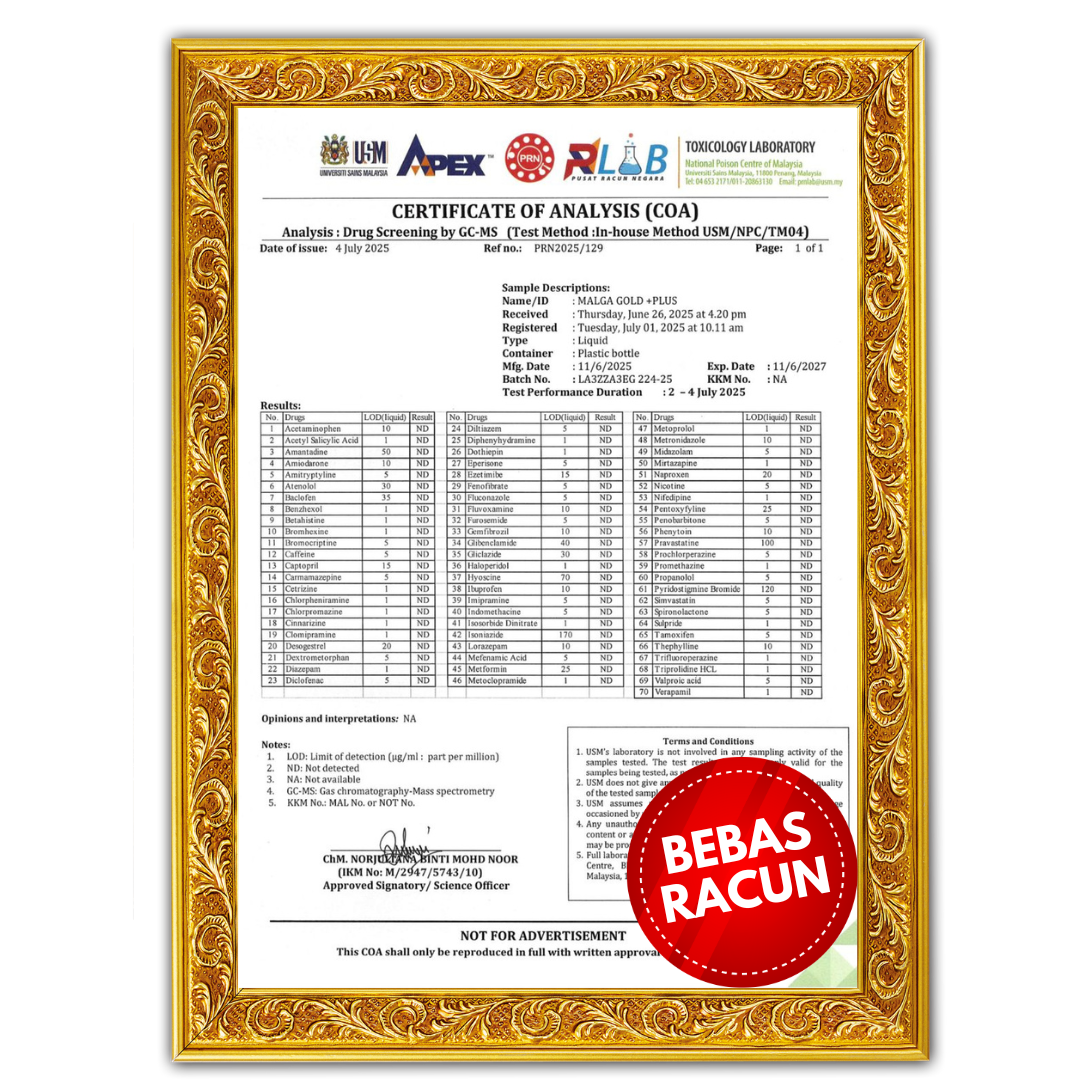 MALGAGOLD+ adalah minuman botani yang selamat dan melalui fasa ujikaji di makmal Universiti Kebangsaan Malaysia, Pusat Racun Negara & Genom Institusi Malaysia